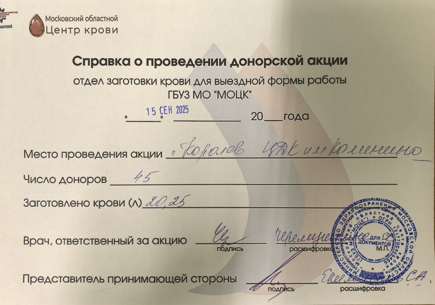 45 человек пожертвовали 20,25 л крови. Их вклад позволит сохранить жизни многих пациентов, нуждающихся в переливании.