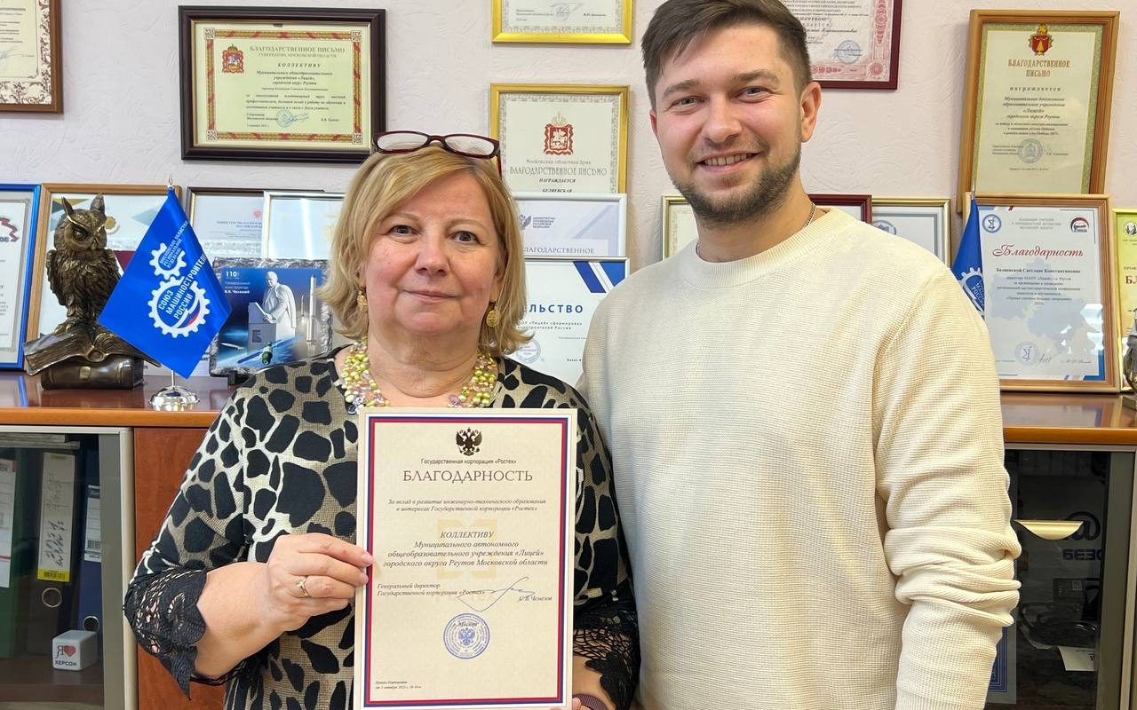 30 октября представитель аппарата Московского областного РО СоюзМаш Алексей Дотолев вручил директору МАОУ «Лицей» г. Реутова, депутату городского Совета Светлане Беляевской благодарность Генерального директора ГК «Ростех», председателя Союза машиностроителей России Сергея Чемезова. Коллектив лицея наградили за вклад в развитие инженерно-технического образования в интересах Государственной корпорации «Ростех».