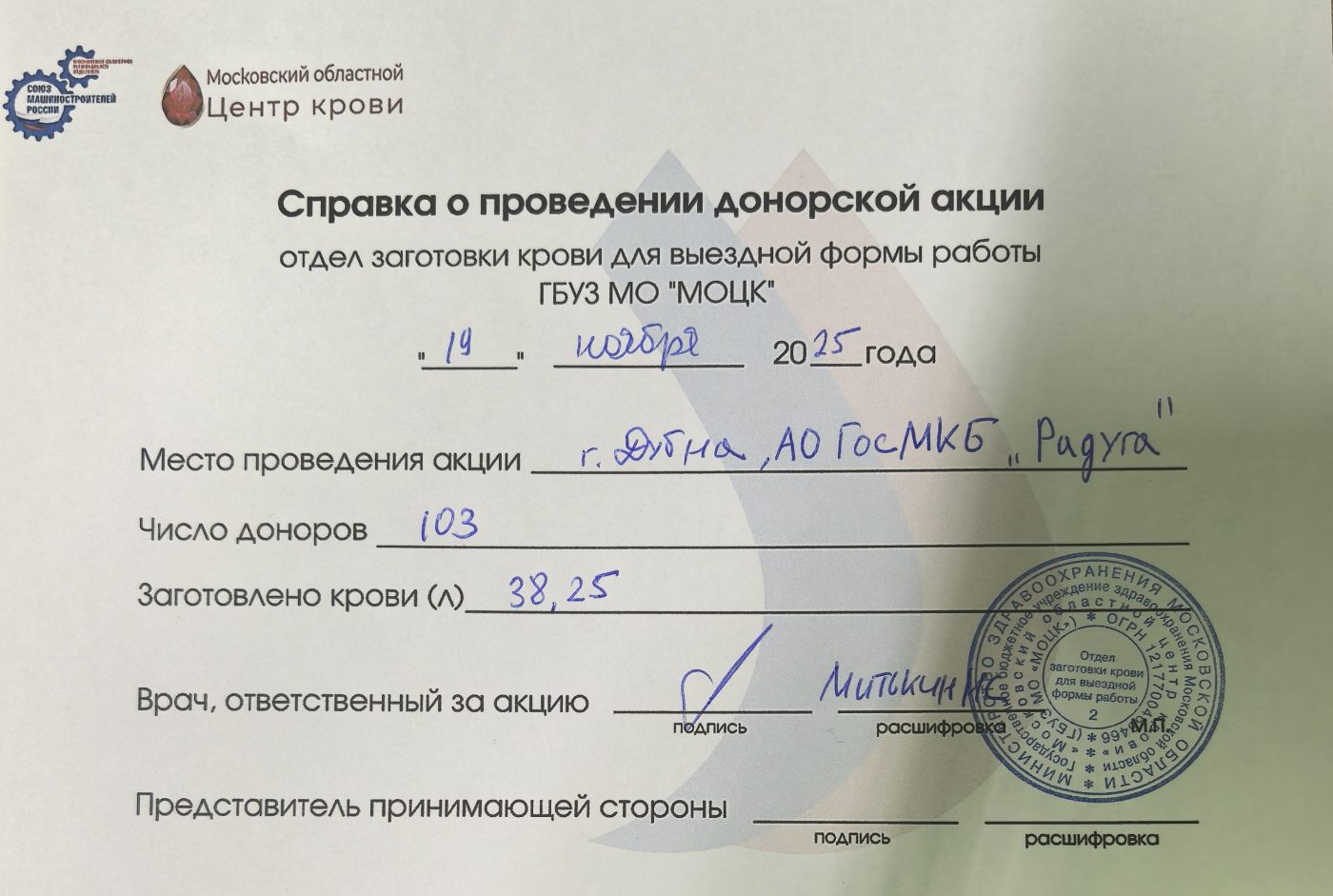 19 ноября Московский областной центр крови и Московское областное реготделение СМР провели День донора в Дубне в рамках программы «Корпоративный донор Подмосковья». Забор крови проходил на базе АО «ГосМКБ «Радуга» им. А.Я. Березняка».