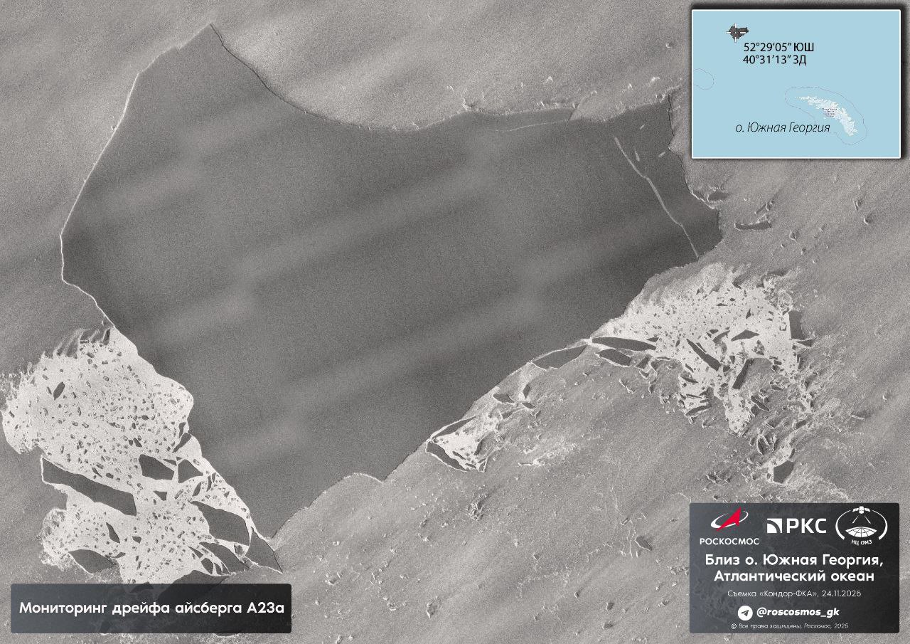 1 декабря ГК «Роскосмос» опубликовала снимки дрейфующего в Атлантическом океане айсберга А23а. Кадры были сделаны спутником «Кондор-ФКА».