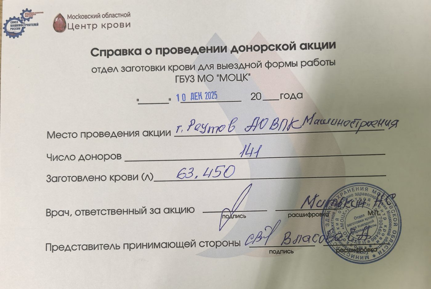 10 декабря в Реутове состоялась донорская акция, организованная службой социального развития АО «ВПК «НПО машиностроения» совместно с Московским областным РО СоюзМаш и Московским областным центром крови в рамках программы «Корпоративный донор Подмосковья». День донора стал для фирмы финальным в 2025 году.