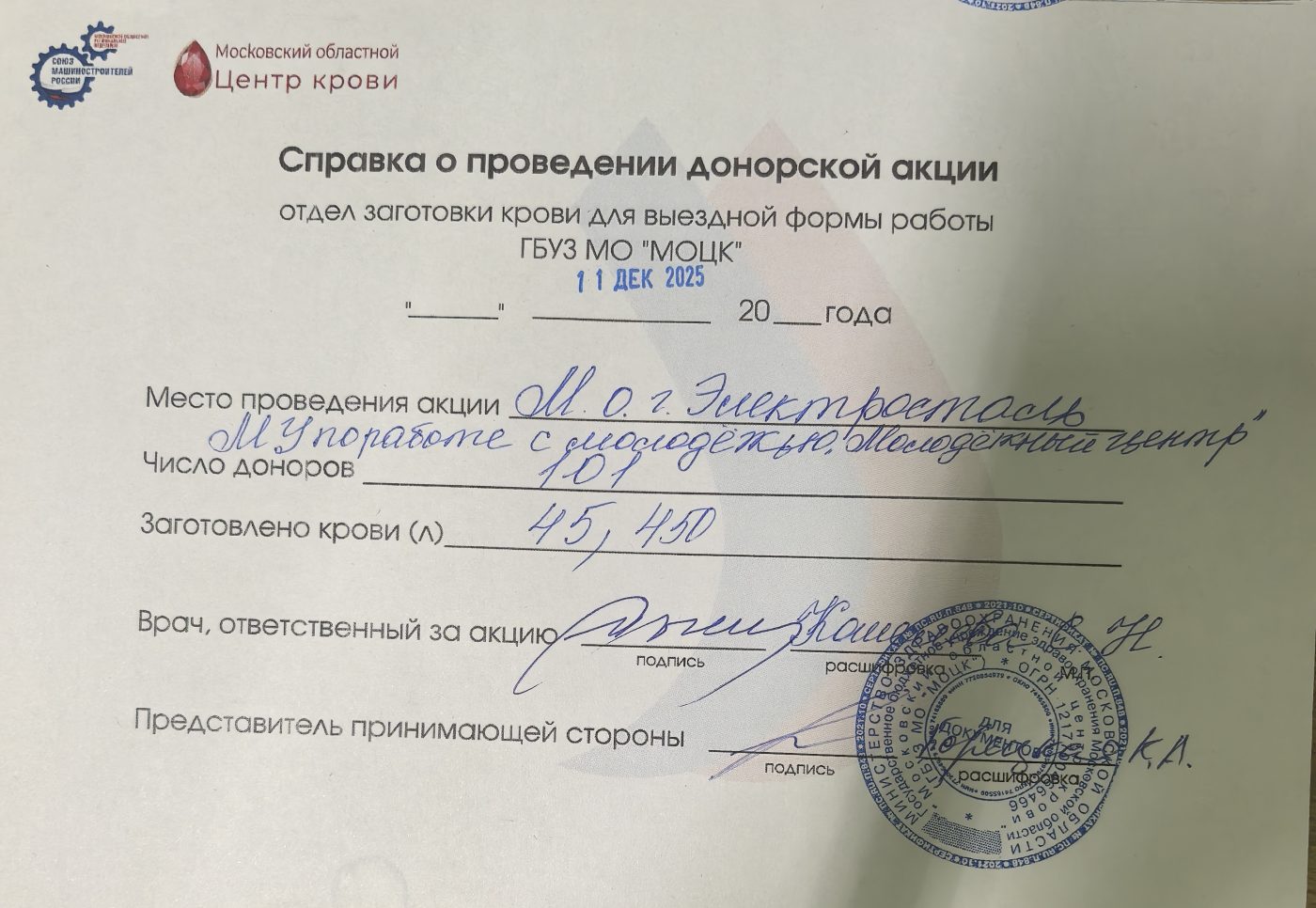 11 декабря в рамках программы «Корпоративный донор Подмосковья» в Молодежном центре г. Электросталь прошел День донора. Такие акции систематически проводит Московский областной центр крови совместно с Московским областным реготделением Союза машиностроителей России.