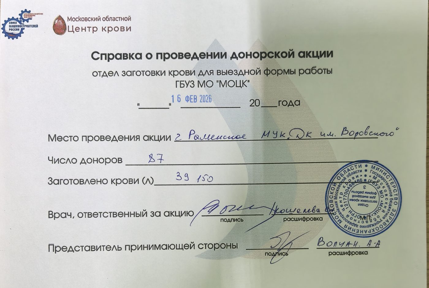 Персонал отдела заготовки Московского областного центра крови принял 87 человек, которые сдали 39,15 л крови. Среди участников акции были проживающие в Раменском сотрудники предприятий, входящих в Московское областное реготделение Союза машиностроителей России.