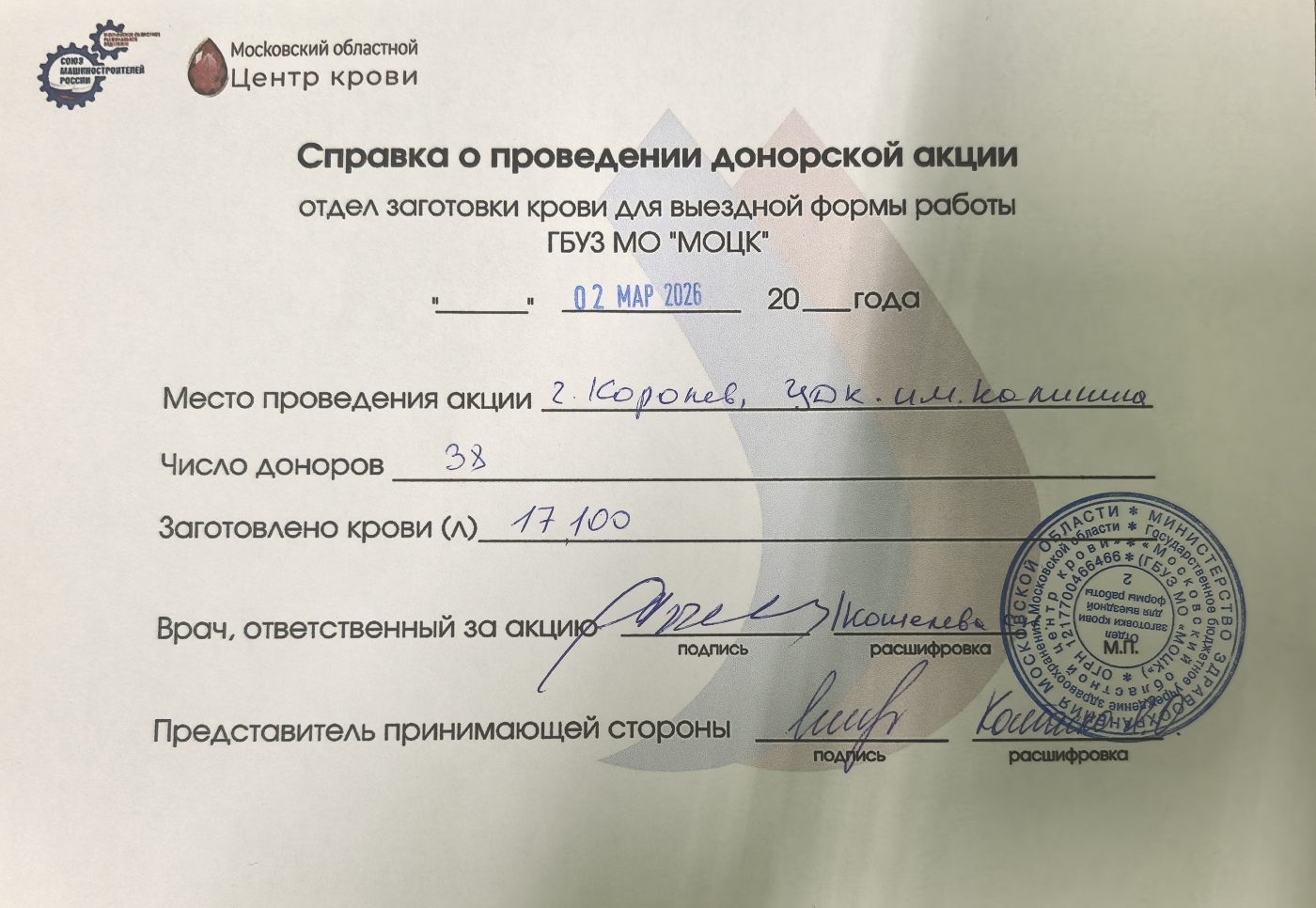 2 марта в подмосковном Королеве прошел День донора, организованный Московским областным реготделением Союза машиностроителей России и Московским областным центром крови в соответствии с соглашением о сотрудничестве.
