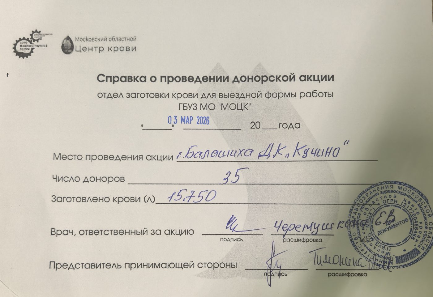 Персонал отдела заготовки Московского областного центра крови принял 35 человек, которые сдали 15,75 л крови. Среди участников акции были сотрудники балашихинских предприятий, входящих в Московское областное реготделение Союза машиностроителей России.