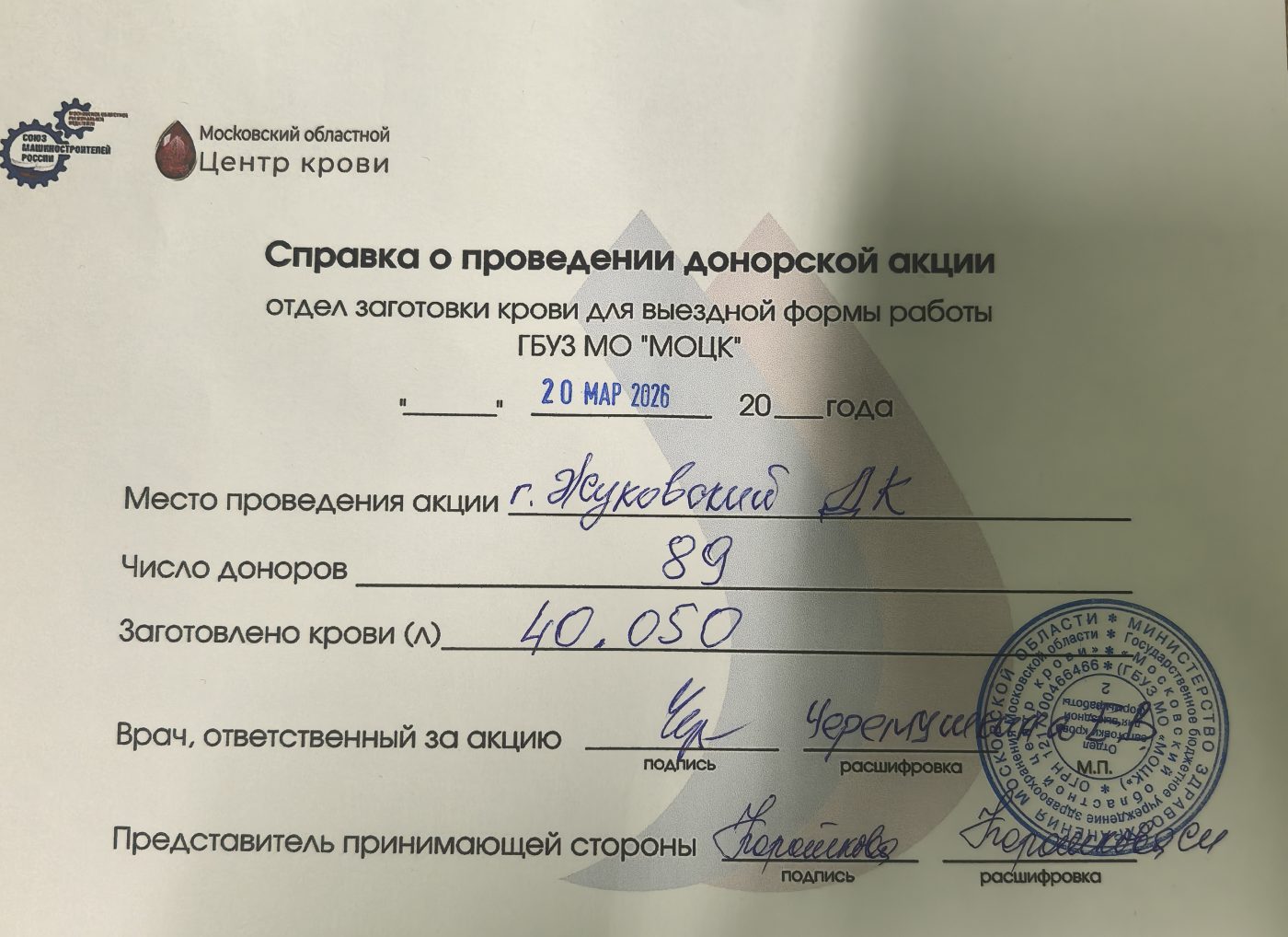 20 марта в рамках программы «Корпоративный донор Подмосковья» в Жуковском прошел День донора, участие в котором приняли жители наукограда и сотрудники Центрального аэрогидродинамического института, входящего в Московское областное реготделение СоюзМаш.